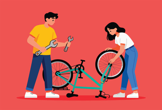 Mechanic repair window spare bicycle nearby tools organized garage through vector pumps
