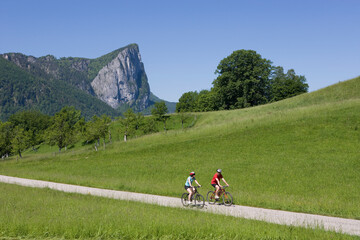 Couple cycling on mountain bikes in Salzkammergut near Drachenwand mountain