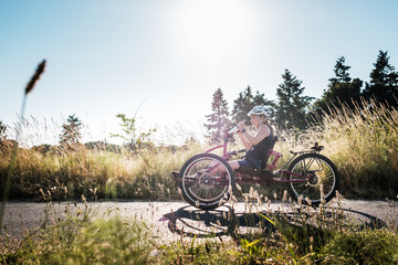 ACTIVE Young couple biking on a forest road in mountain on a spring day