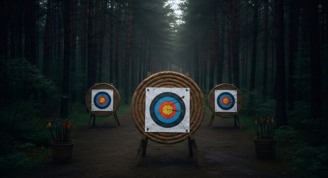 Archery target with arrows in dark forest. Three round hay target boards stand ready for bow and arrow practice in a misty woodland setting.