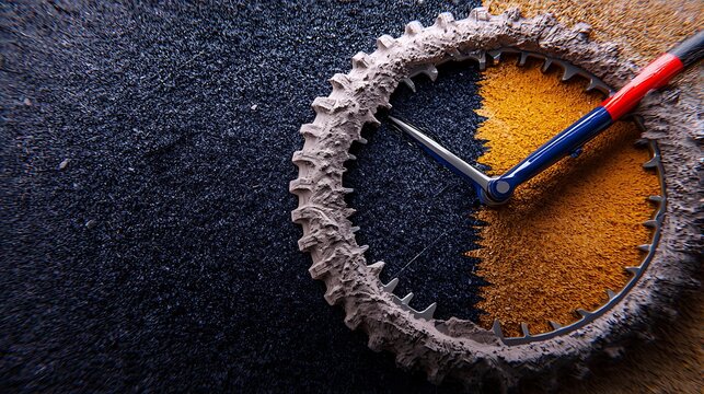 Close-up of a bicycle gear surrounded by colorful sand, symbolizing time and cycling culture