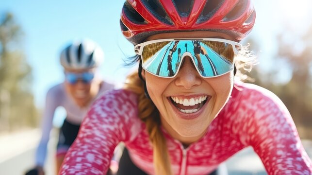 A cheerful woman rides her bicycle outdoors, wearing sunglasses and a helmet, showcasing the exhilarating spirit of cycling, fitness, and determination in a scenic environment.