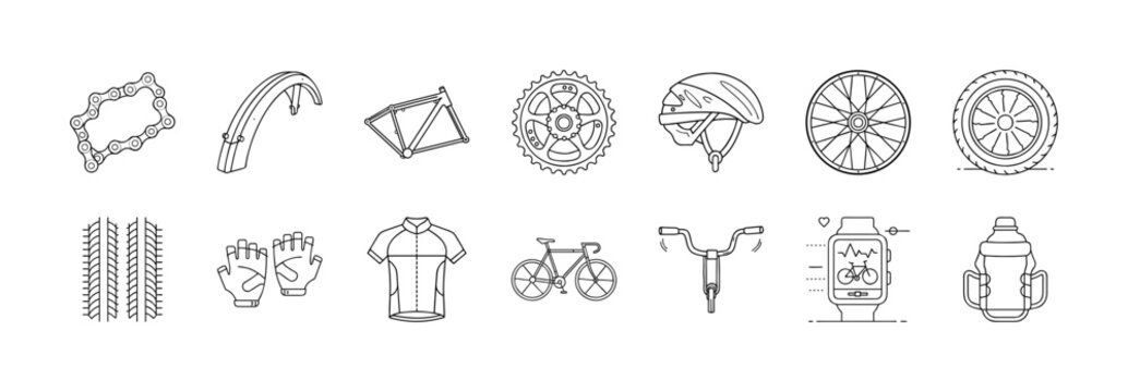 Bicycle parts and accessories outline icons set - Collection of black and white line icons showing different bicycle components and cycling gear, including wheels, helmets, pedals, frames, tires