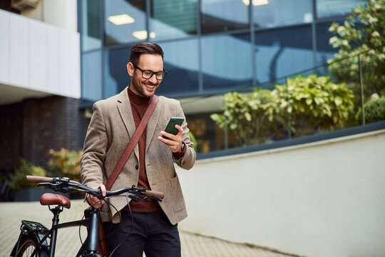 A smiling businessman pushing a bicycle and using a mobile phone, outdoors.