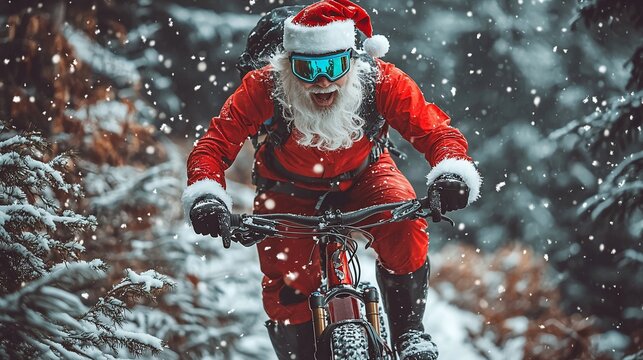 Santa Claus mountain biking in snowy forest, wearing a red suit, Santa hat, and goggles.