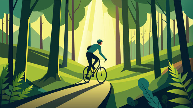 A cyclist riding through a dense forest the sunlight filtering through the trees and casting dappled shadows on the path.. Vector illustration
