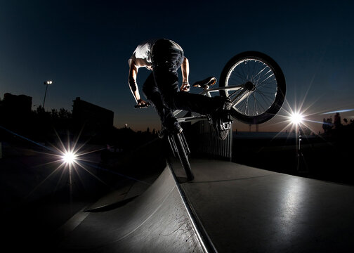 A professional cyclist rides and performs tricks on bmx. Beautiful stunts and bike jumps in the park on a concrete platform with obstacles. Man.