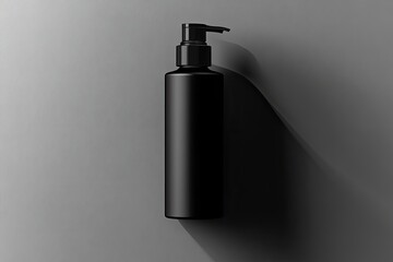 A sleek, black cylindrical bottle with a pump dispenser casts a shadow on a neutral gray background