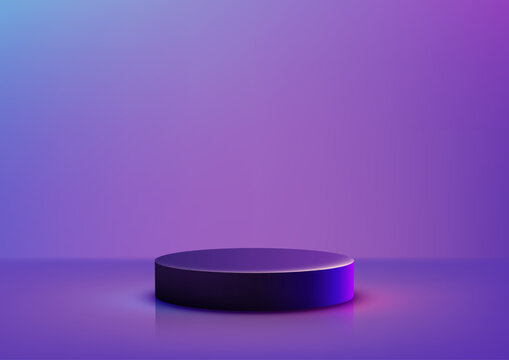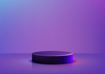 product display mockup with black cylindrical podium glowing pink blue light on vibrant gradient background for modern branding, abstract showcase, technology and advertising concept