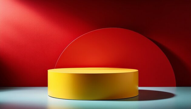 vibrant yellow cylindrical podium on circular base with bold red wall cutout minimalist modern product display mockup showroom