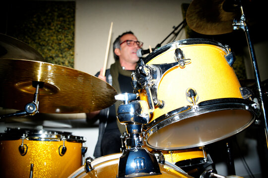 Jazz drummer playing in dimly lit club, focus on hands and cymbals