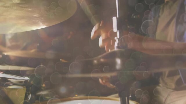 A musician practices playing drums with intense focus in a moody and artistic studio ambiance.