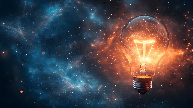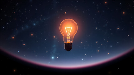 A light bulb floating in space, glowing softly among the stars, symbolizing cosmic ideas