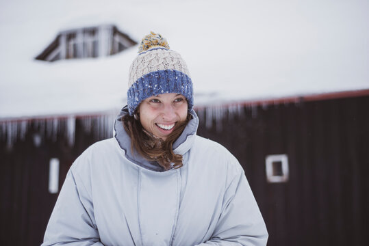 Healthy young woman in snow and old building smiles happily in Czech