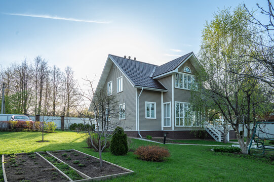 Contemporary two-story house of timber in countryside in summer. House have nice landscaping, with shrubs, green lawn and blooming trees. Russian dacha in Moscow region.