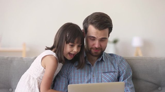 Happy dad and cute child daughter watching cartoons on laptop