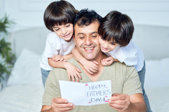 The coolest Dad. Portrait of latin father looking happy while his two little boys embracing their dad, giving him handmade postcard, greeting with Father's day, spending time together at home