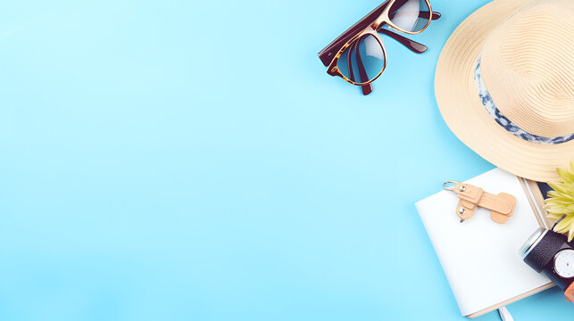 travel essential on blue background  Stylish Travel Essentials on Vibrant Blue Background: Sunglasses, Hat, Wallet, Coffee Cup - Perfect Accessories for Your Next Vacation or Business Trip.