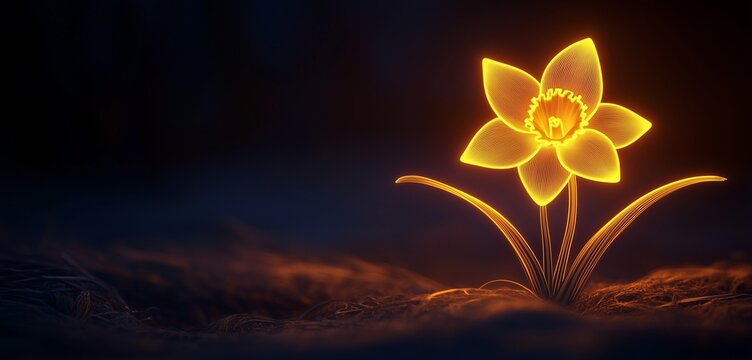 Minimalist neon daffodil, its yellow glow brightening a dark scene.