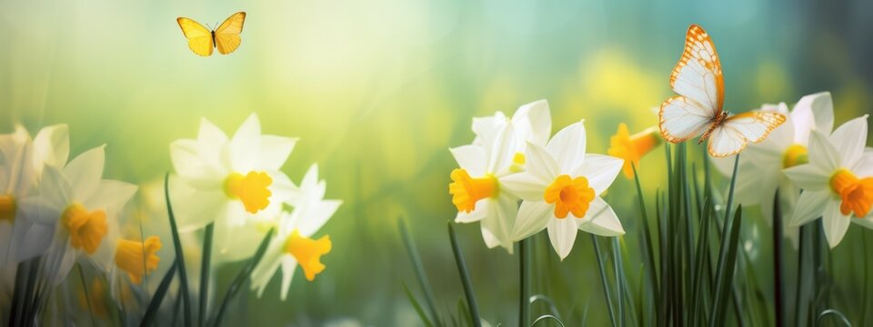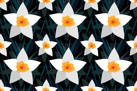 Elegant yellow daffodil flowers with lush green leaves on a soft, watercolor background creating a seamless pattern with a vintage luxury design