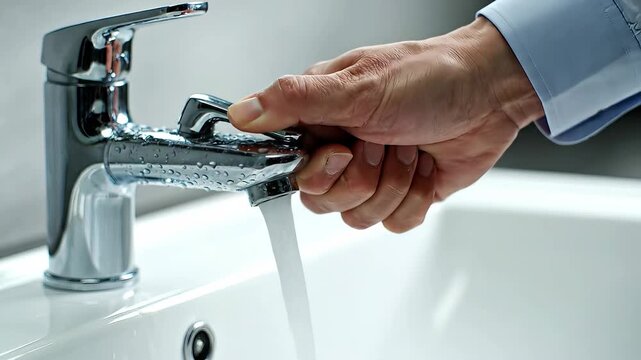 A closeup shot captures a persons hand wearing a light blue shirt meticulously operating a sleek chrome faucet over a pristine white ceramic sink demonstrating the careful act of turning the water on.