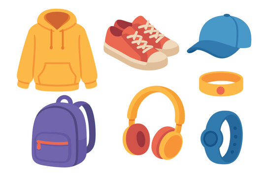 Casual outfit essentials for daily adventures and activities. Set of 6 vector illustration