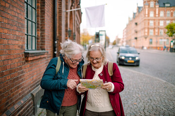 Two smiling senior women walking in city looking at map