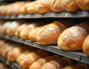 Bakery shelves with fresh bread loaves, warm and golden for daily sales