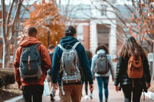 Students carrying backpacks walking down city sidewalk on their way to class, Students walking to class with backpacks