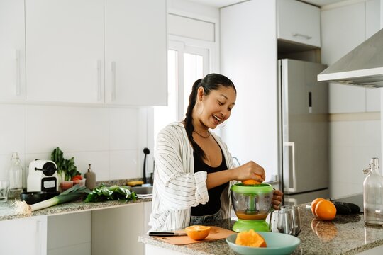 Woman pouring juice from juicer into glass while standing at table next to man and they are smiling