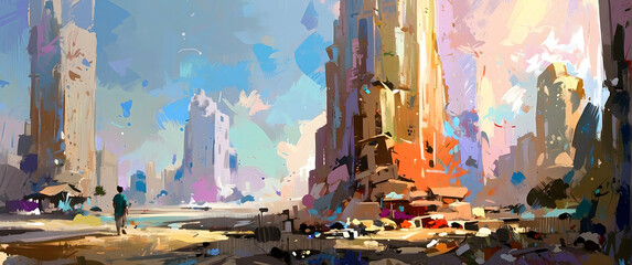 An impressionistic cityscape painting showcasing a bustling metropolis with towering skyscrapers and dynamic brush strokes