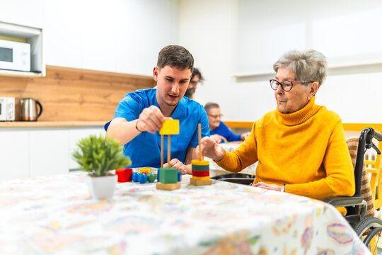 Nurse assisting elderly woman playing with building blocks in nursing home