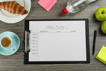 Flat lay composition of clipboard with Meal Plan on wooden table