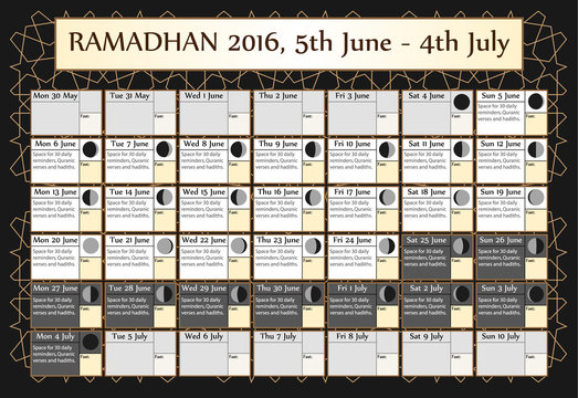 Ramadan calendar 2016, 5th June. Choice: 1st of 3. Includes: fasting tick calendar, moon cycle-phases-, Ramadan quotes. 30 days of Ramadan on black background with Islamic pattern. Vector illustration