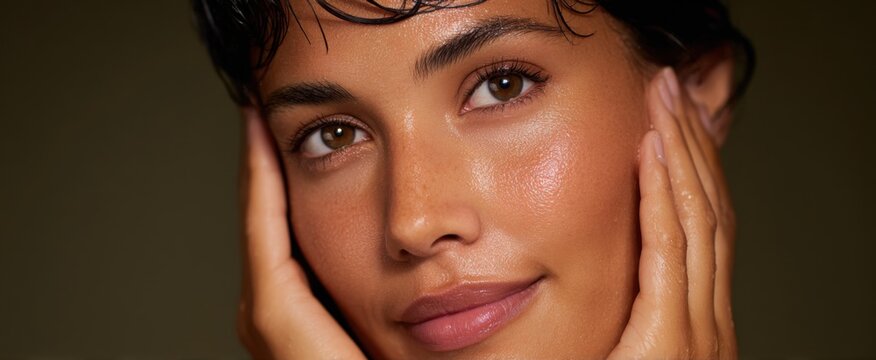 Confident female enjoys a peaceful moment after showering, wrapped in a white towel with a serene expression. Contemporary bathroom setting highlights wellness and daily beauty rituals