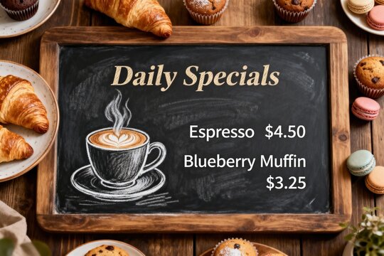 Daily specials chalkboard with espresso and blueberry muffin prices surrounded by pastries and macarons.