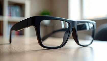 Black smart glasses with camera and mic sit on wooden table. Futuristic eyewear records video photos handsfree. Modern tech gadget for content creation and daily life.