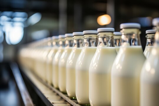 Automated process of filling milk or yogurt into plastic bottles at a modern dairy plant
