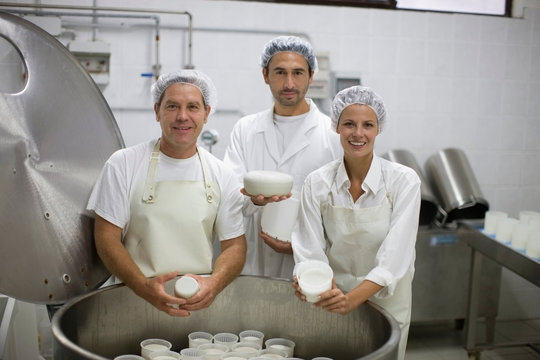 Manual workers in cheese and milk dairy production factory. Traditional European handmade healthy food manufacturing.