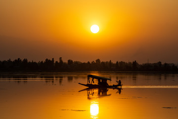 Sunset view over traditional boat or shikara - a type of wooden boat. Shikara are of varied sizes and are used for multiple purposes, including transportation of people.