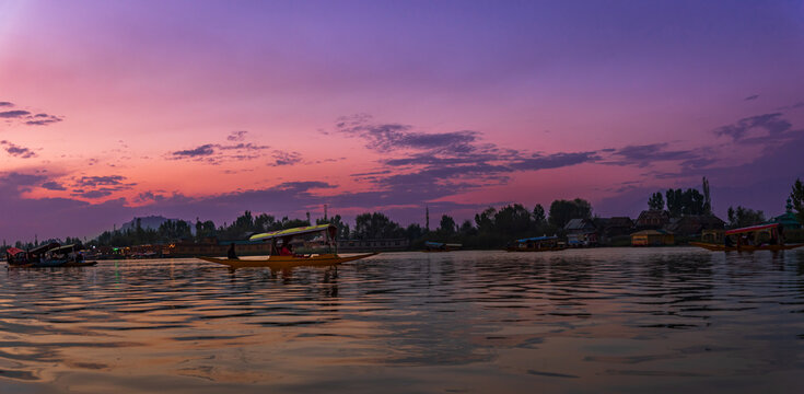 View of Dal Lake during sunset and the beautiful mountain range in the background in the city of Srinagar, Kashmir, India. It is a popular tourist destination for houseboats and shikara boats.