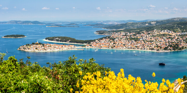 Primosten town on a peninsula vacation in the Mediterranean Sea panorama in Primošten, Croatia