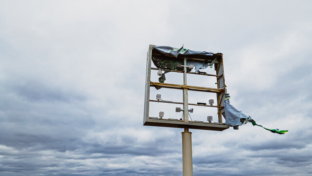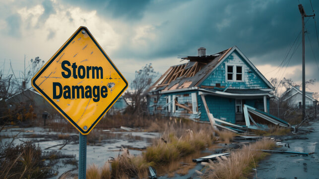 Storm damage on yellow warning signboard with hurricane wind damaged house on blur background