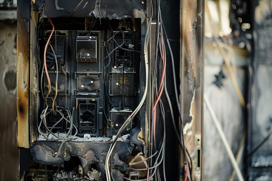 Close-up of a burnt electrical panel with damaged wires and components, showing signs of fire damage and charring.