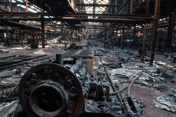 An abandoned and dilapidated industrial factory interior with charred machinery and scattered debris, showing signs of severe damage and decay.