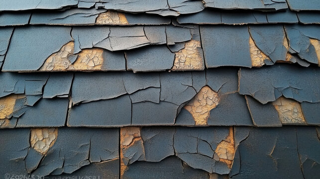 Close-up of damaged asphalt roof shingles showing signs of significant wear and deterioration, with cracked and lifted sections exposing underlying layers