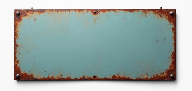 Rusty metal sign isolated on white background. Turquoise blank horizontal signboard, copy space. Aged, worn, scratched, unlabeled surface texture. Grunge, rustic, retro design. Grimy, nostalgic
