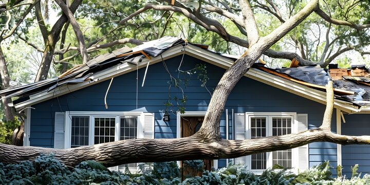 House damaged by fallen tree during storm. Concept Storm Damage, Tree Removal, Home Repairs, Insurance Claims, Dealing with Contractors