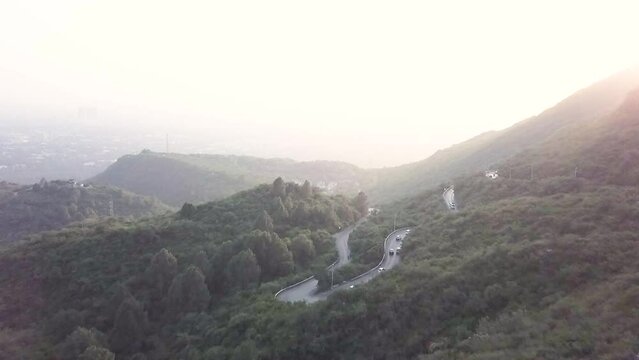 Aerial cinematic shot of curve road at  daman e koh . An aerial landscape photography of a city of Islamabad ,the capital of Pakistan