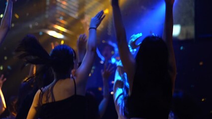 Women and men have fun in dance party. Group of young people dancing in night club.